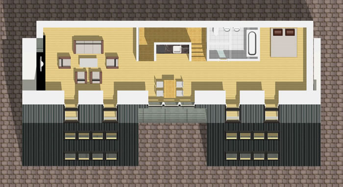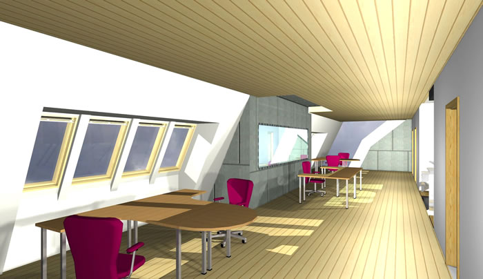 Střechu haly budou tvořit střešní okna značky Velux a bude na ní pouze minimum střešní krytiny. V showroomu budou funkční kanceláře a ukázkový byt. Ve fotogalerii si můžete prohlídnout vizualizaci naší vzorkovny.